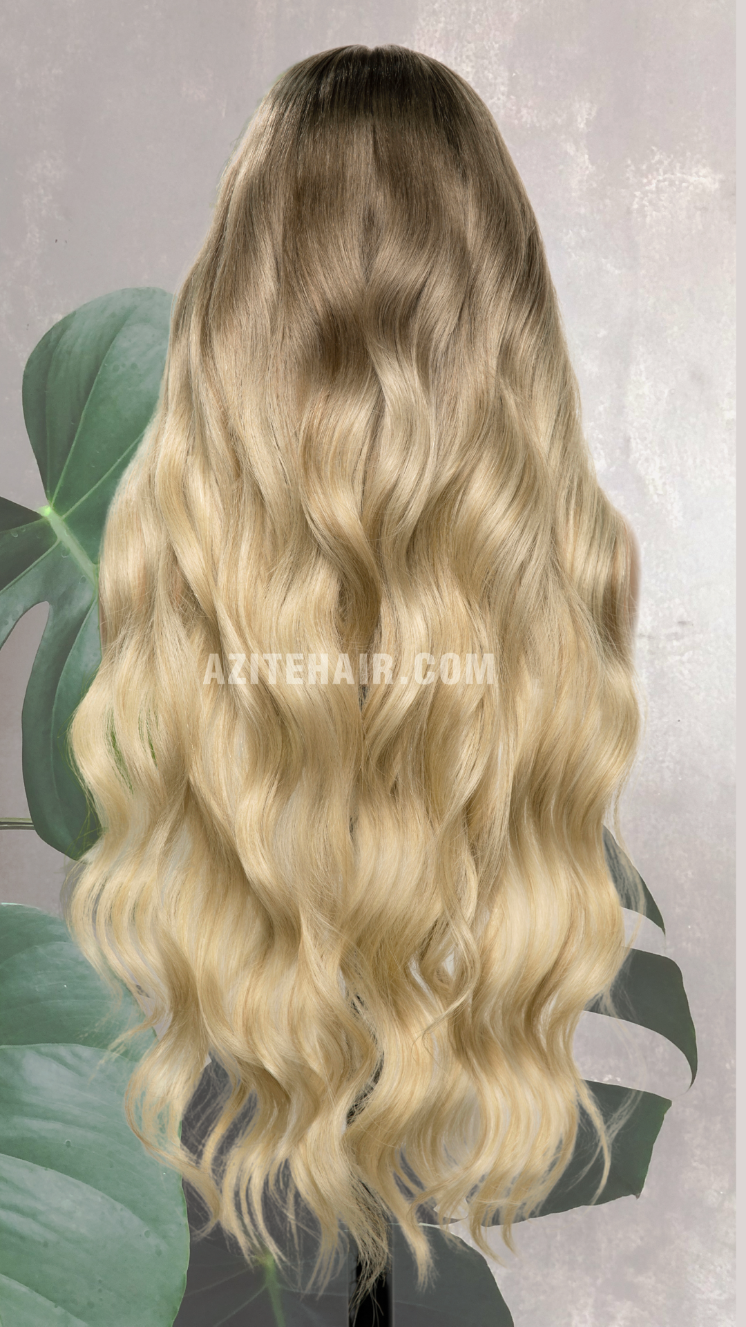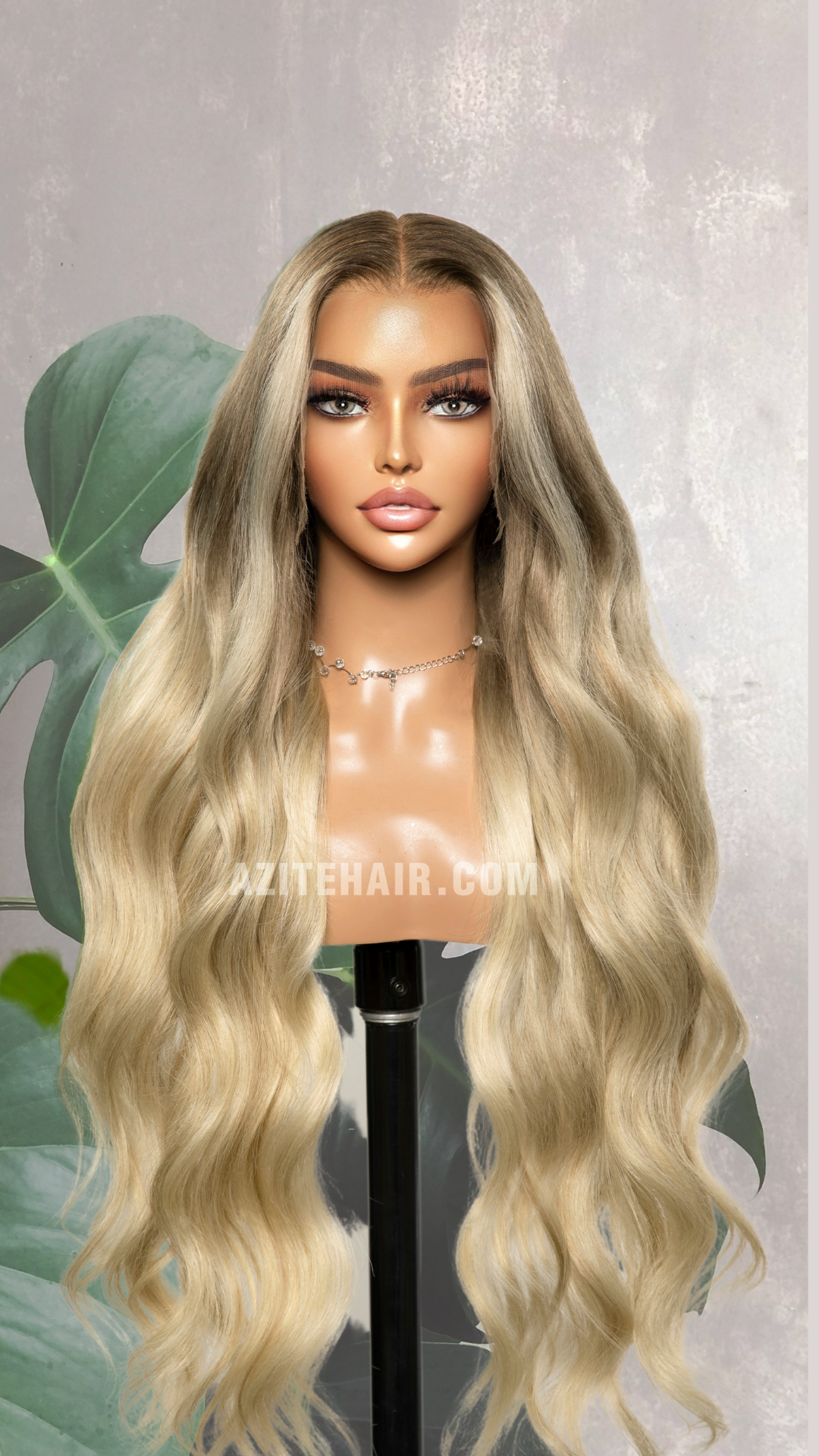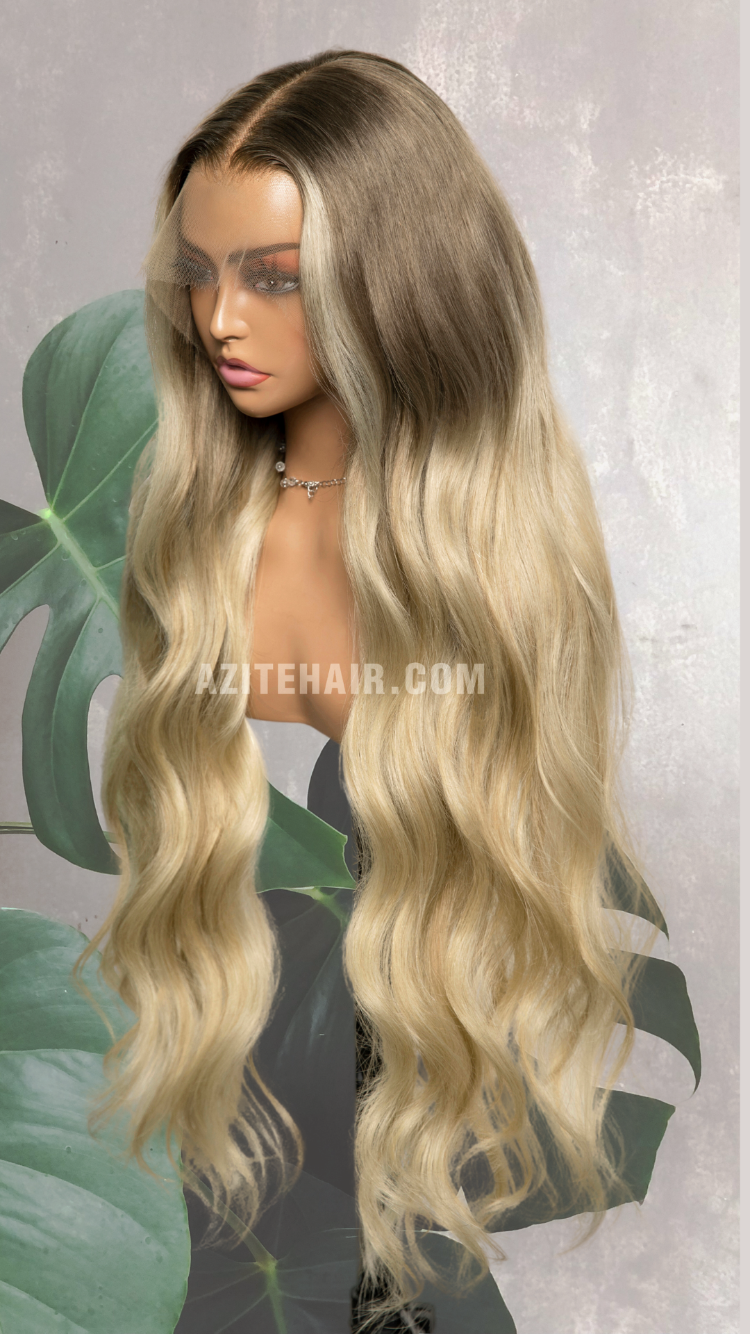 Princess Lily is filled with subtle lush platinum tones. If you love blondes then this is perfect for you. It has no brassy tones and even though the hair has had color applied, it’s still very soft and manageable. She comes beautifully colored with high and low lights of ash blonde. This unit is made with 100% Peruvian Hair so the hair can be washed and styled with flat iron. Frontal Wig made with three bundles and a closure.